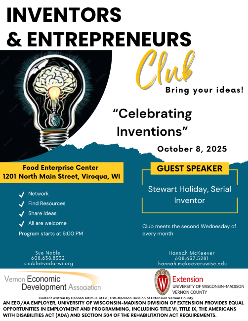 Join us at the Food Enterprise Center in Viroqua for this month’s Inventors & Entrepreneurs Club meeting. he topic is Celebrating Inventions, featuring guest speaker Stewart Holiday, a Vernon County serial entrepreneur.